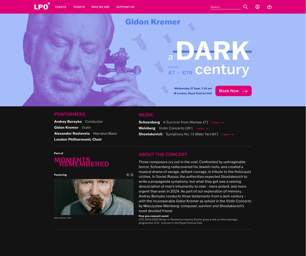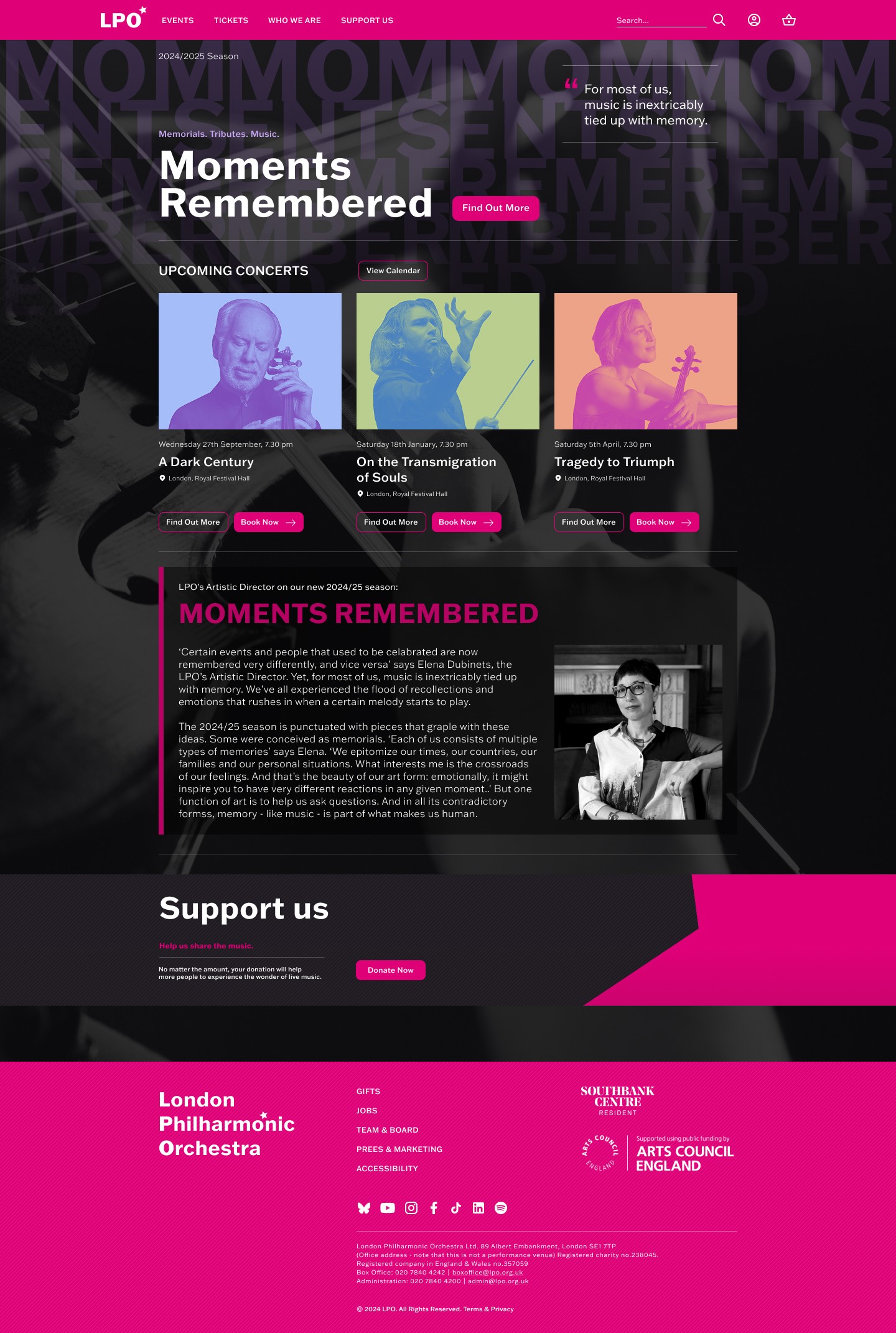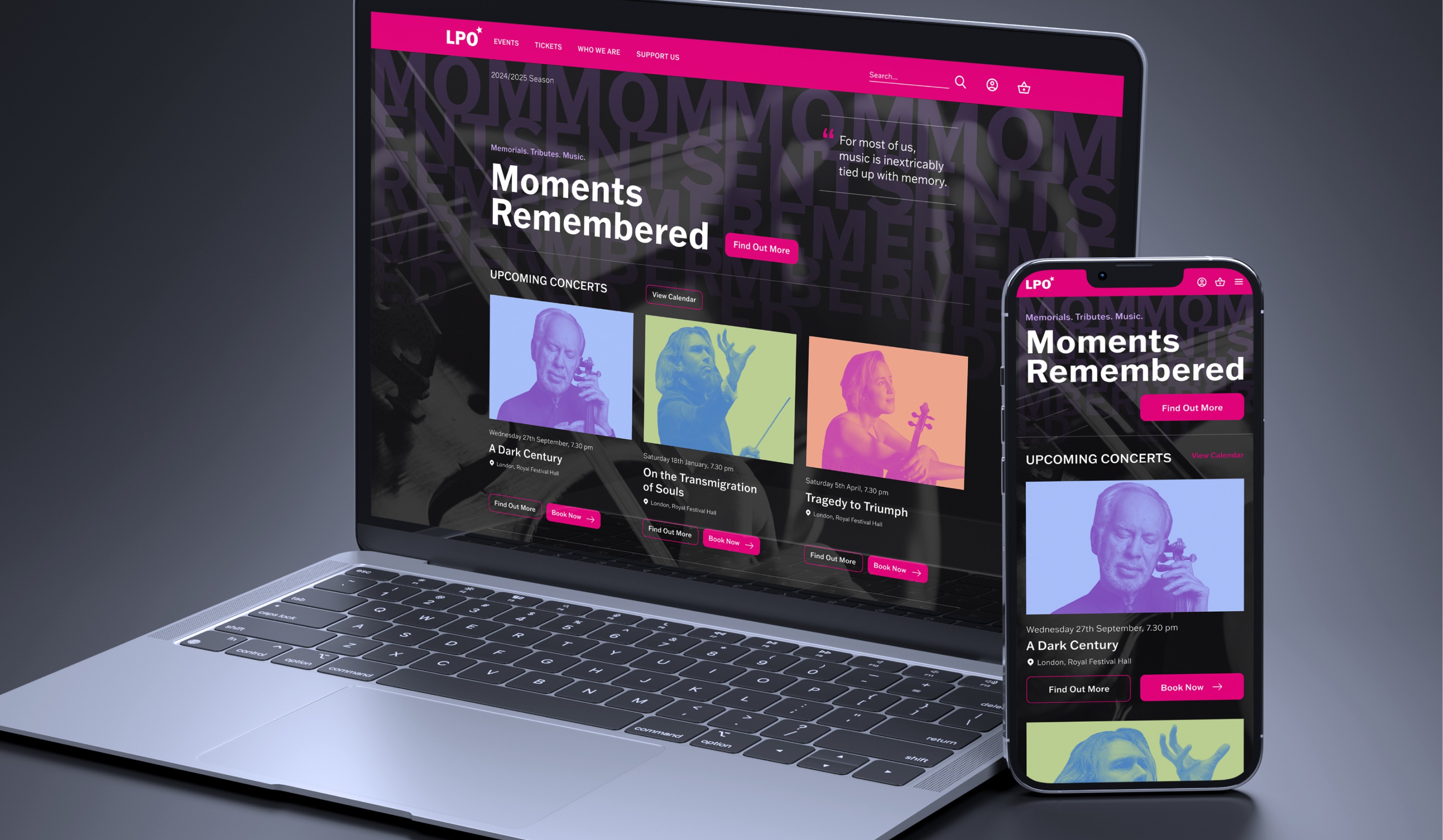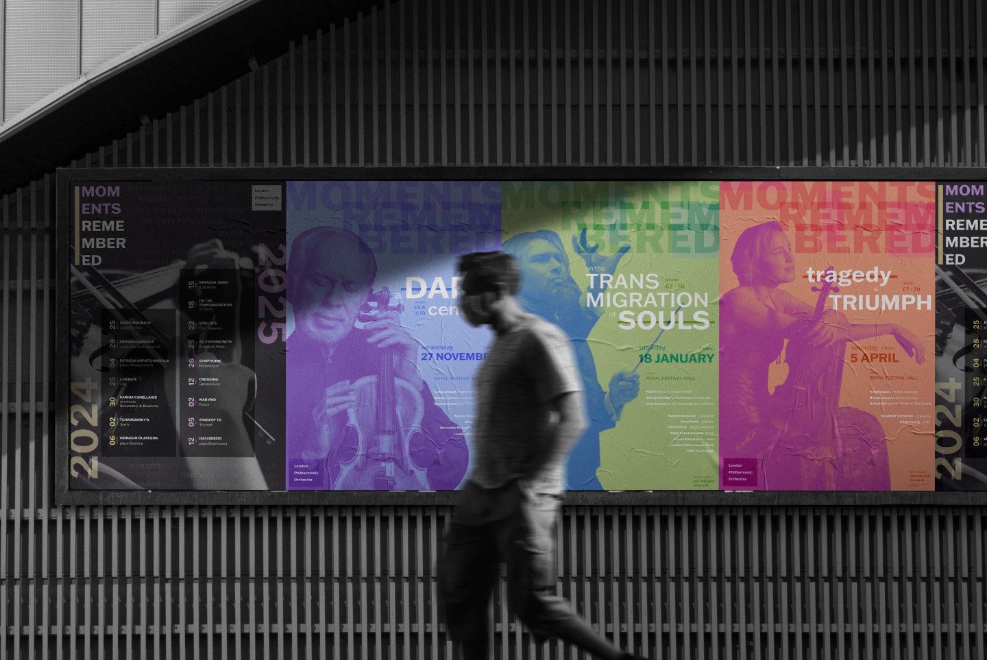 Multiplatform campaign for the London Philharmonic Orchestra’s Moments Remembered concerts, including posters, digital campaigns, and a website.