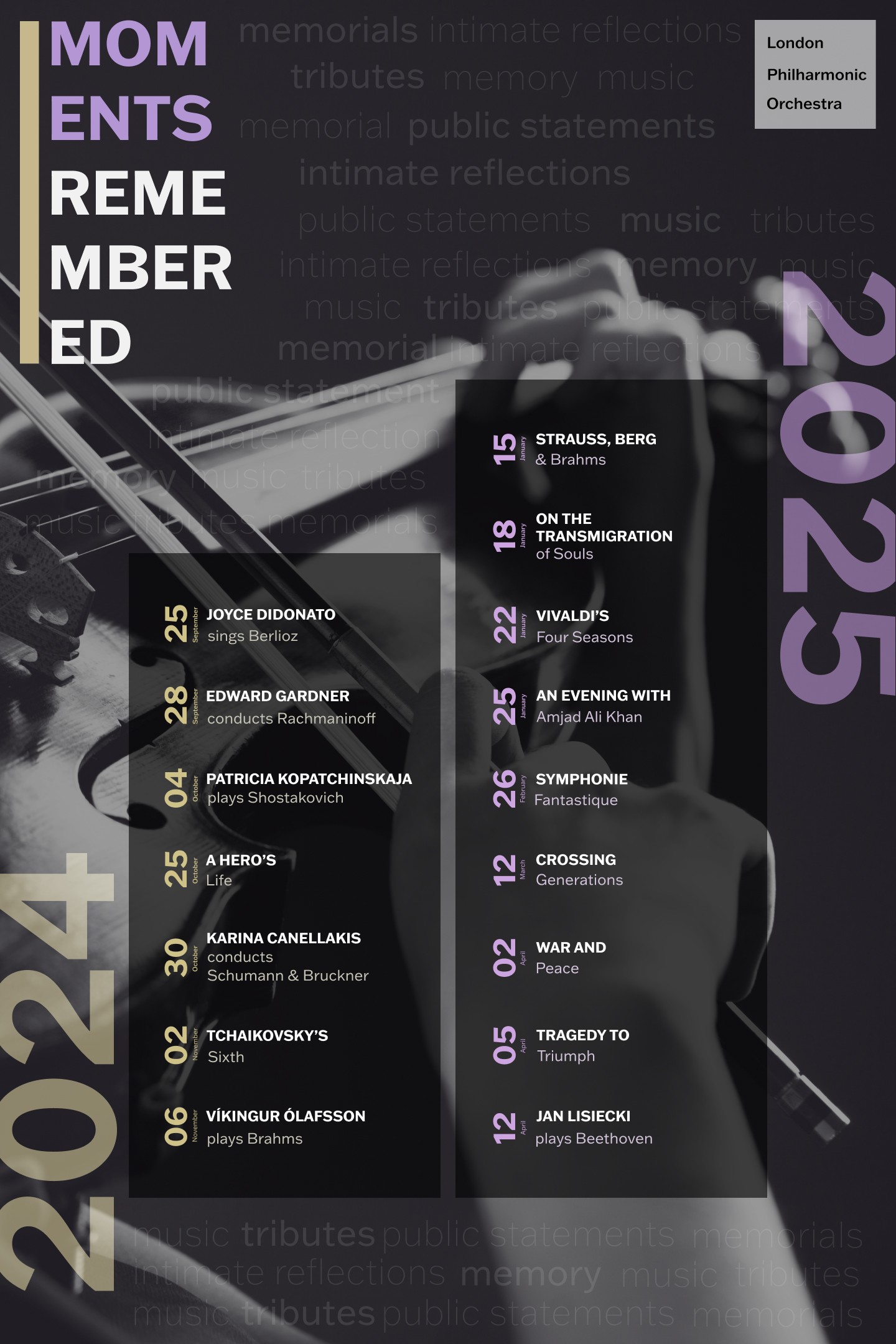 Independent multiplatform campaign concept for the London Philharmonic Orchestra’s Moments Remembered concerts, including posters, digital campaigns, and a dedicated website section.
